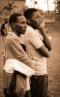 Ved siden af vores lejlighedskompleks ligger en stor jordfodboldbane, hvor de lokale gadebørn holder til. Før vi kunne tage hul på dagens program med Kampalas største moské som mål, skulle Lasses computer repareres, hvorfor Jacob og jeg gav os til at følge den lokale fodboldkamp fra vejsiden. Det småregnede og børnene gled rundt på banen i deres forsøg på at tæmme bolden. Til trods for det var Jacob meget imponeret over de unge drenges fodboldevner. Da Lasse mødte os der, blev vi stående. En ung fyr i træningstøj og stopur om halsen kom op til os. “I see you are enyoing the game.” Navnet var Joshua, og han viste sig at være træner for gadebørnenes fodboldhold.