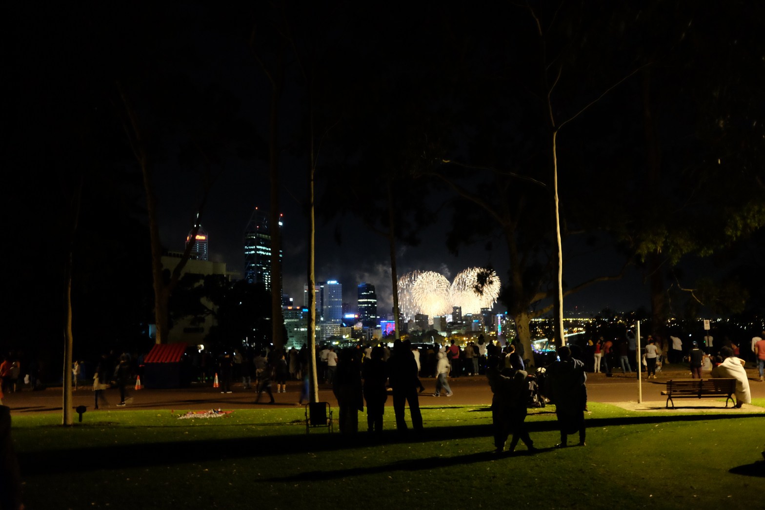 Parken var faktisk fyldt med mennesker. Men ikke som man ville opleve det i Danmark med råbende unge, fulde, champagnedrikkende mennesker med nytårskrudt i lommerne, hvor man blot kan krydse fingre for at den tomme vinflaske med raketten ikke vælter eller, at man ikke lige har overset et kanonslag. Her sad familier, unge og ældre stille og roligt og ventede på at klokken blev 24 med udsigt over Perths skyline. Private må ikke affyre nytårskrudt i Australien, hvilket vi ikke vidste på forhånd, men det gjorde det alt andet lige til en langt mere behagelig oplevelse, når vi nu kom trillende med en lille dreng i klapvognen. Således børnefamilie.