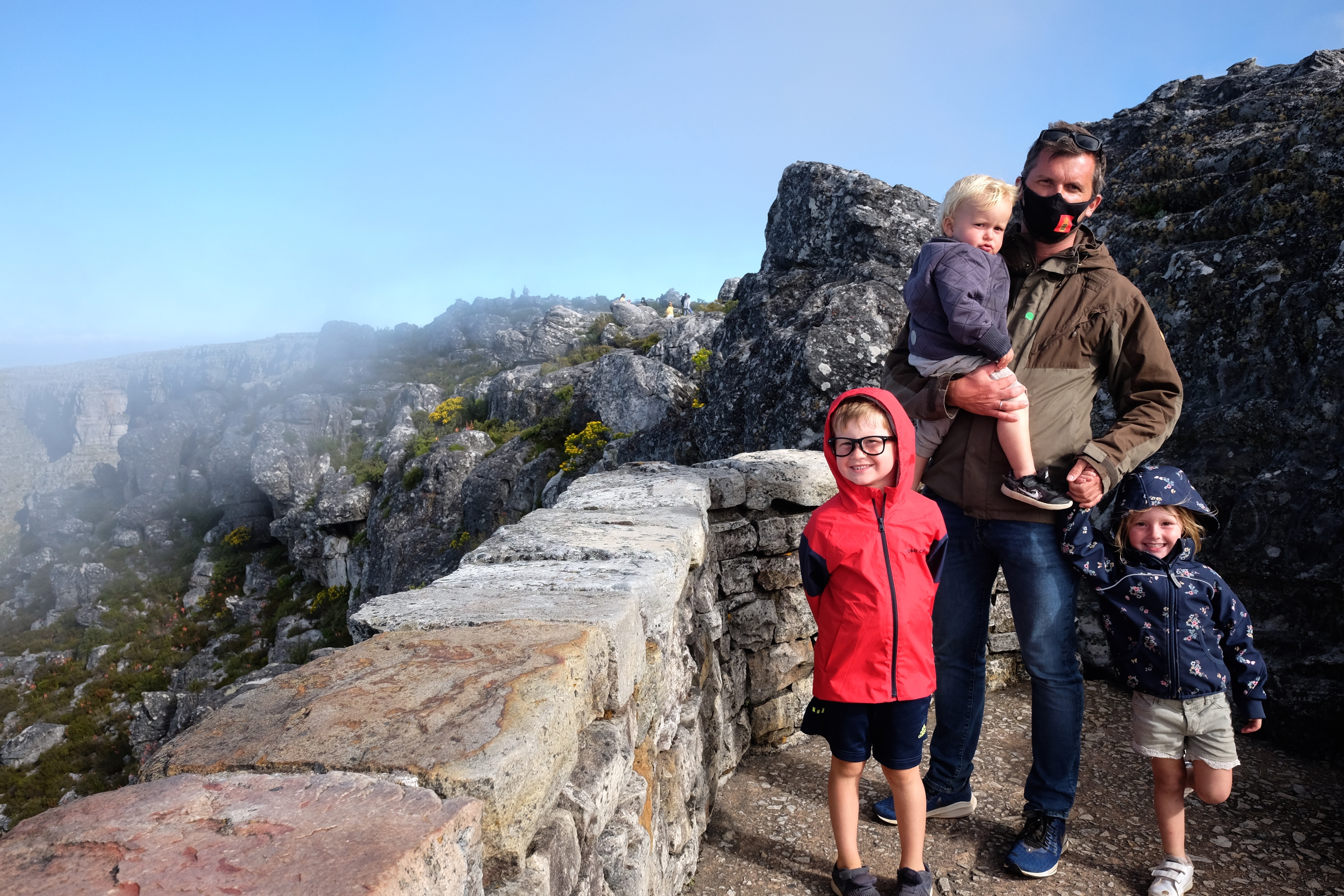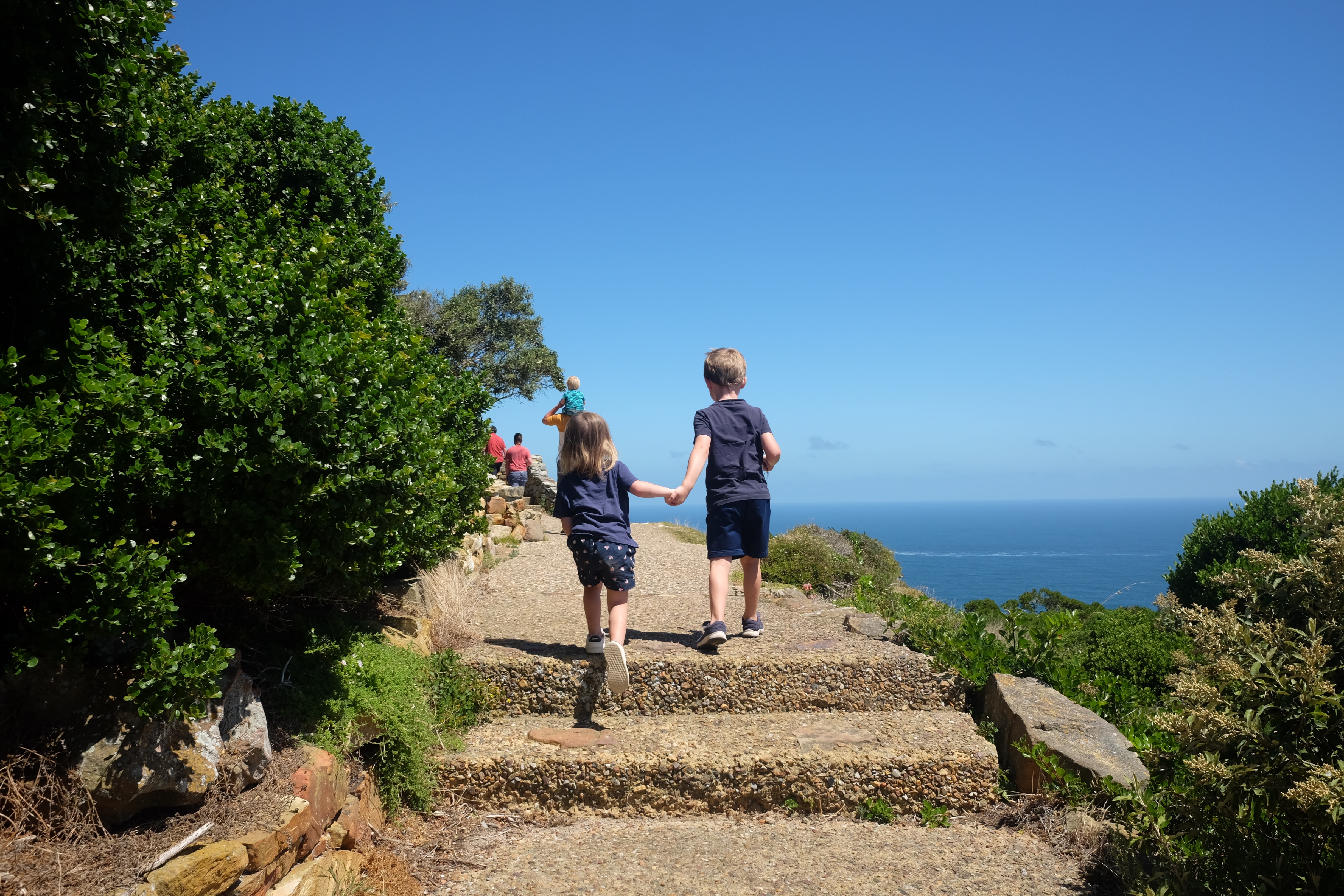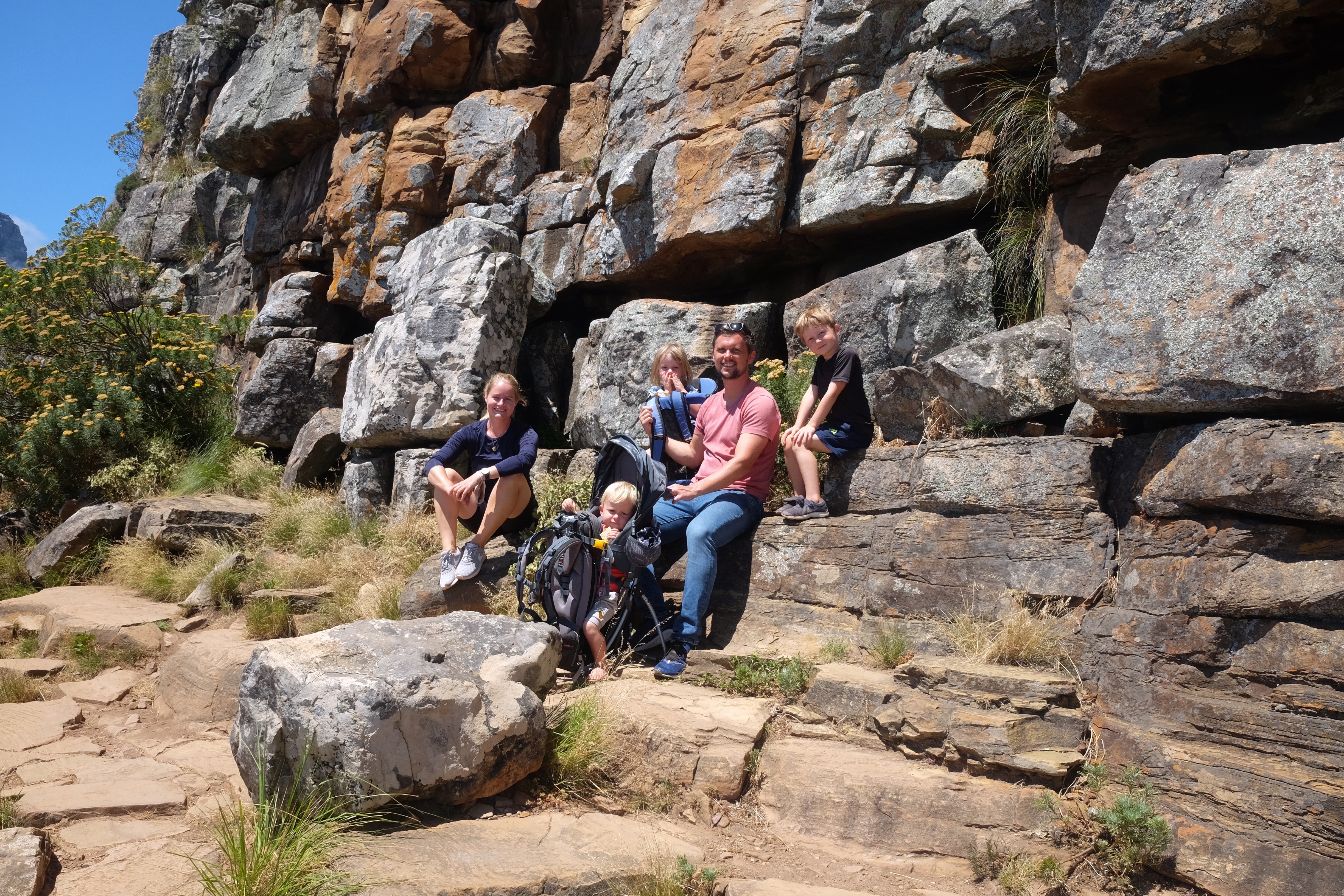 Da vi var kommet halvvejs rundt om bjerget, hvor vi havde udsigt til Camps Bay og Clifton blev stien afløst af trapper, og trapperne blev afløst af sten. Stien blev herefter markant mere opadgående, vi måtte endda kravle op ad en stige og så blev det smalt. Rigtig smalt. På et tidspunkt var stien vel ikke mere end knap en meter bred, og med en bjergside, man ikke havde lyst til at trille ned ad, vendte vi om. Der var sat en kæde op, man kunne holde fast i, og det var sin sag at holde balancen med et barn på ryggen og ikke mindst holde fast i Villads samtidigt. Så vi kom en hel tur rundt om bjerget, men vi når først toppen den dag bedsteforældrene er på besøg og passer ungerne et par timer.