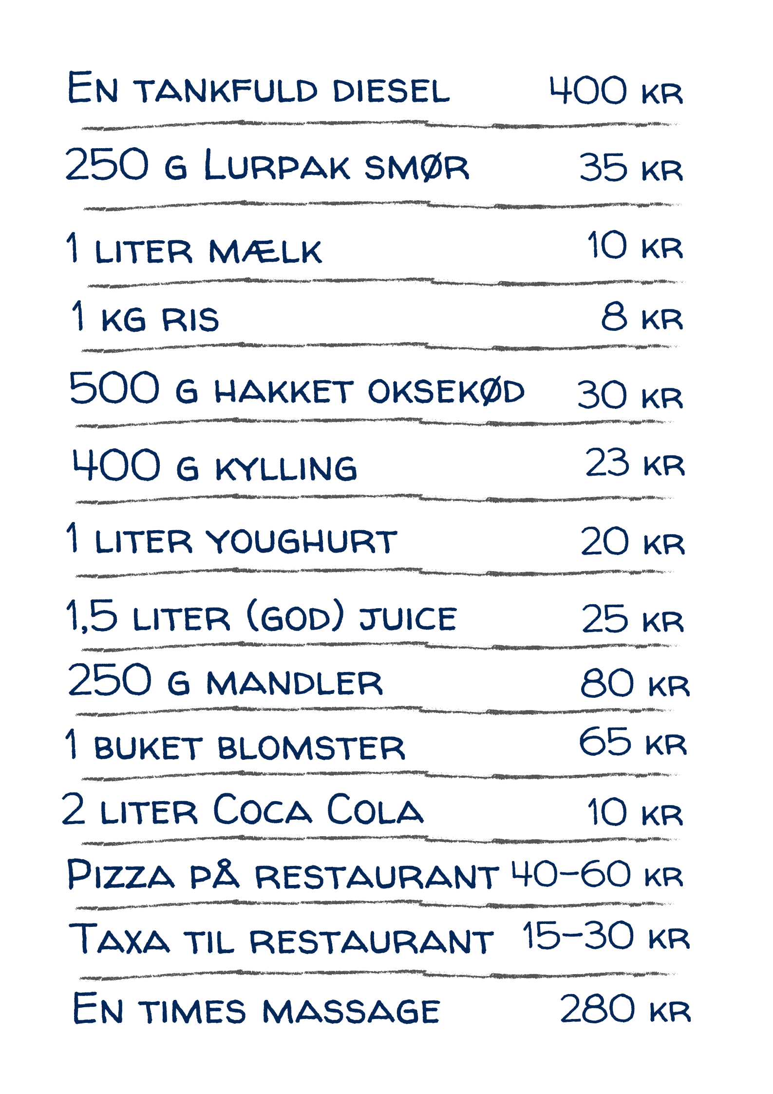Listen omfattede intet mindre end 164 ting, der skulle prissættes; alt fra tomater, undertøj, hårtørrer, kortspil, biografbilletter og hele vejen til løn for en husholderske og prisen på bilservice. Herunder har vi samlet et lille udsnit af de dagligdagsting, som vi bruger flest penge på. Vi skal nok lige nævne, at rækkefølgen er vilkårlig – vi spiser ikke mere smør end vi drikker mælk!