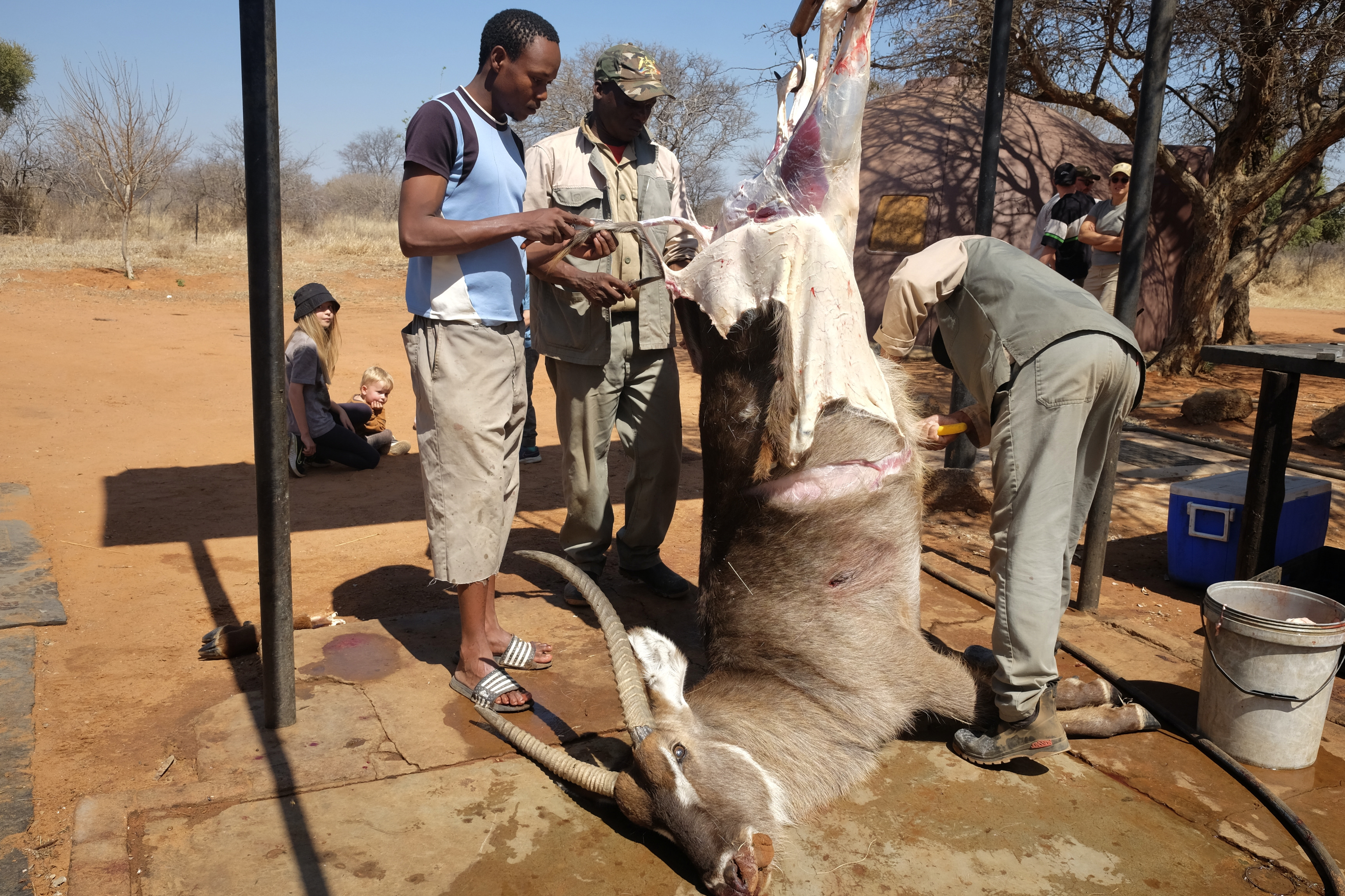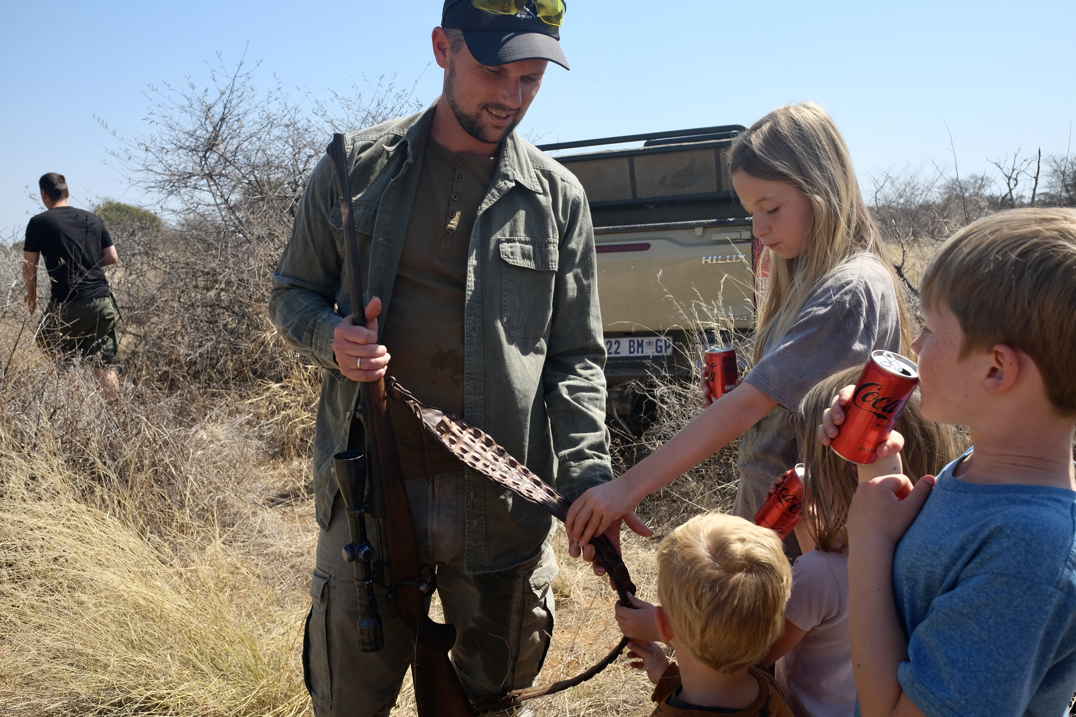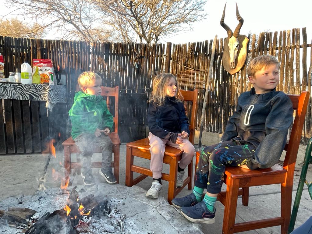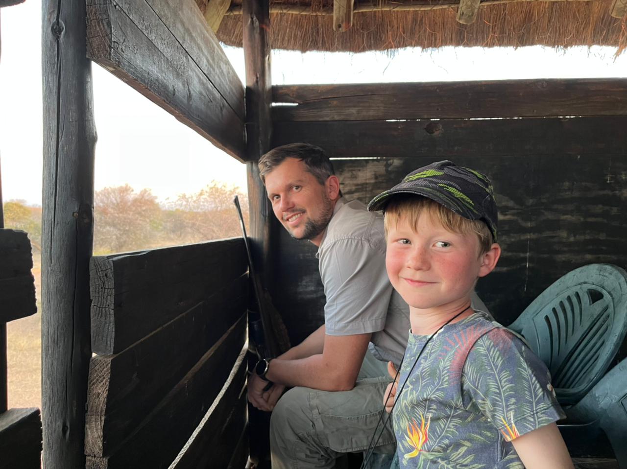 Lejren vi befandt os i ligger i Limpopo provinsen på grænsen til Botswana. Den grågrønne grumsede Limpopoflod, som Rudyard Kipling ville kalde den, markerer grænsen og løb blot 50 meter fra lejren. Tæt nok på til at vi kunne høre høje plask fra krokodillerne, når de fangede mad. I løbet af de tre dage blev der affyret seks skud og nedlagt seks dyr fordelt på tre familier. Heldigvis ikke mere end to til os; hhv. en impala og en waterbuck. Maden blev lavet over bål og ungerne fik både mulighed for at fiske i Limpopofloden og tage med på jagt.