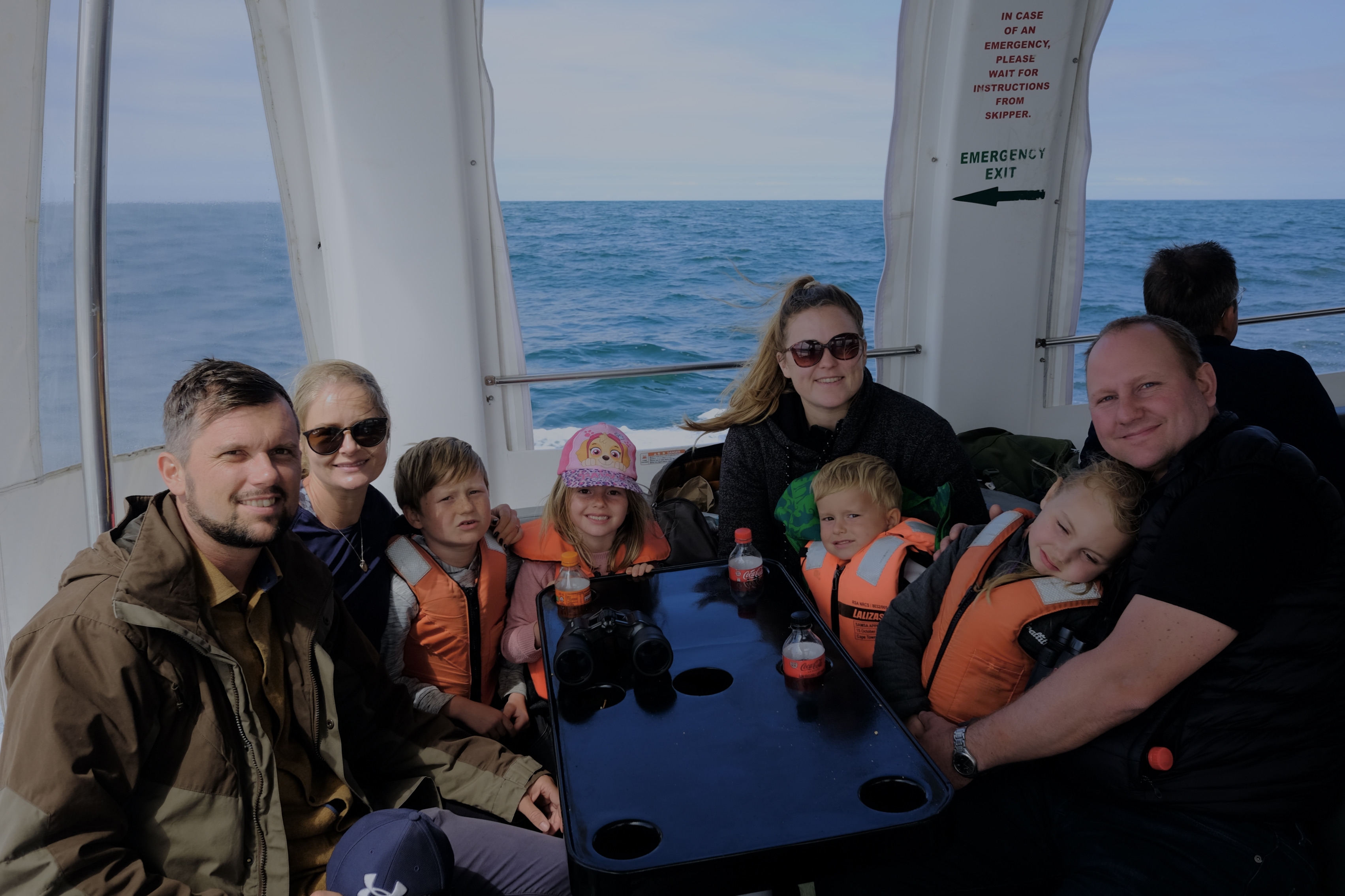 Ungerne fik redningsveste på og vi var forberedte på høj bølgegang, hvorfor hele flokken nogle timer forinden havde taget søsygetabletter. Om det var tabletterne eller den egentlige rolige søgang, så var vi heldigvis på intet tidspunkt udfordret af sejladsen. Vi sejlede et kvarters tid før vores to guides første gang pegede frem for sig. De havde set en mor og en unge, som bliver sammen de første tre år af ungens liv. Men ikke nok med det, så var ungen hvid, hvilket kun ses i 3% af tilfældene. Og ifølge de turistvenlige guides, betød det selvfølgelig held. Den købte vi, for vi følte virkelig også, at vi havde heldet med os. I de knap to timer som ekskursionen stod på cirklede de to hvaler om båden, og kom undersøgende tæt på os.